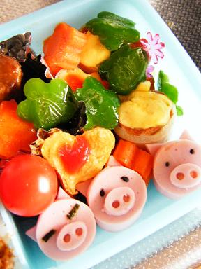 玉子焼きはハート型、ちくわはハムと一緒に渦巻き。