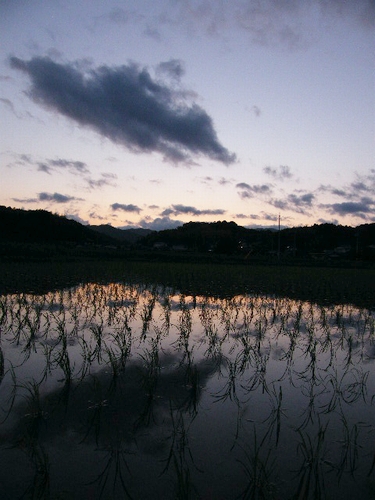 植えつけられたばかりの田んぼに映る、空の雲。