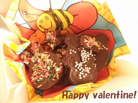 チョコを溶かして、型に入れて、チョコスプレーなんかを飾って冷やして完成。