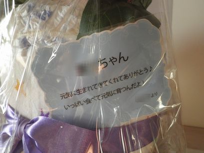 赤ちゃんグッズのレッグウォーマーも巻いてあって、リボンとお花。